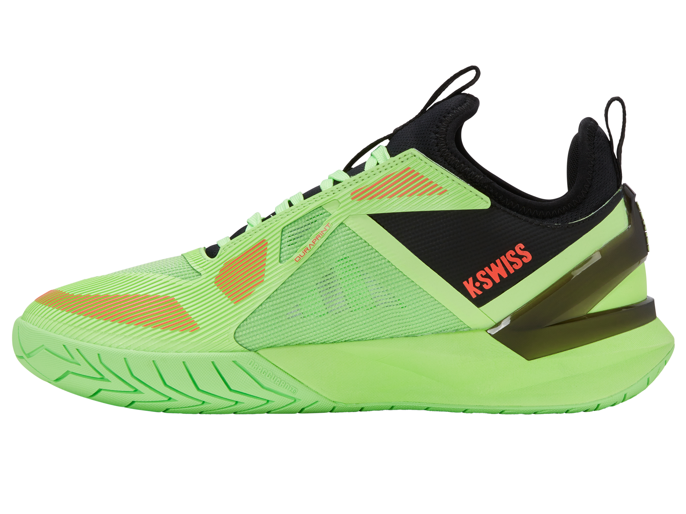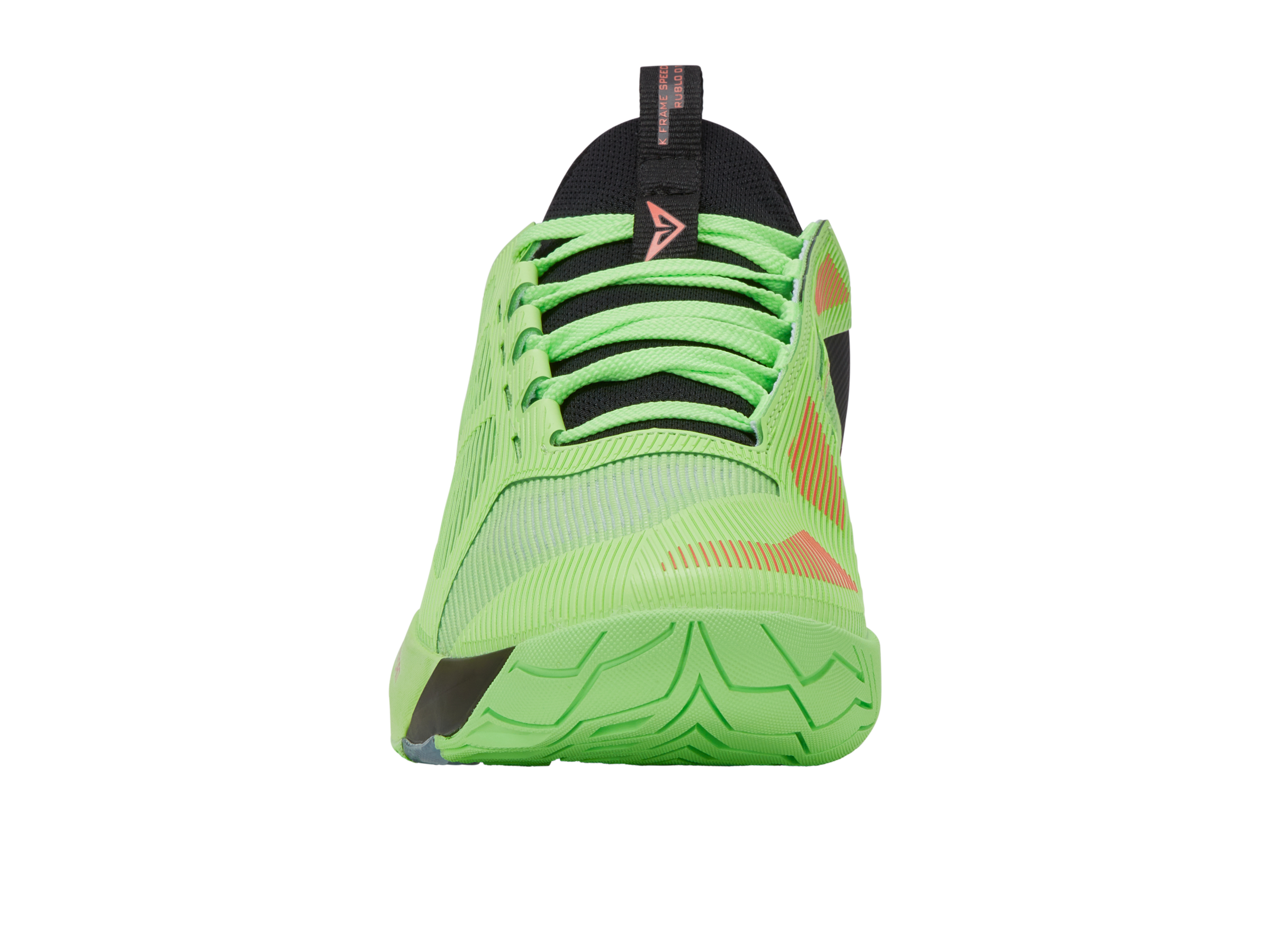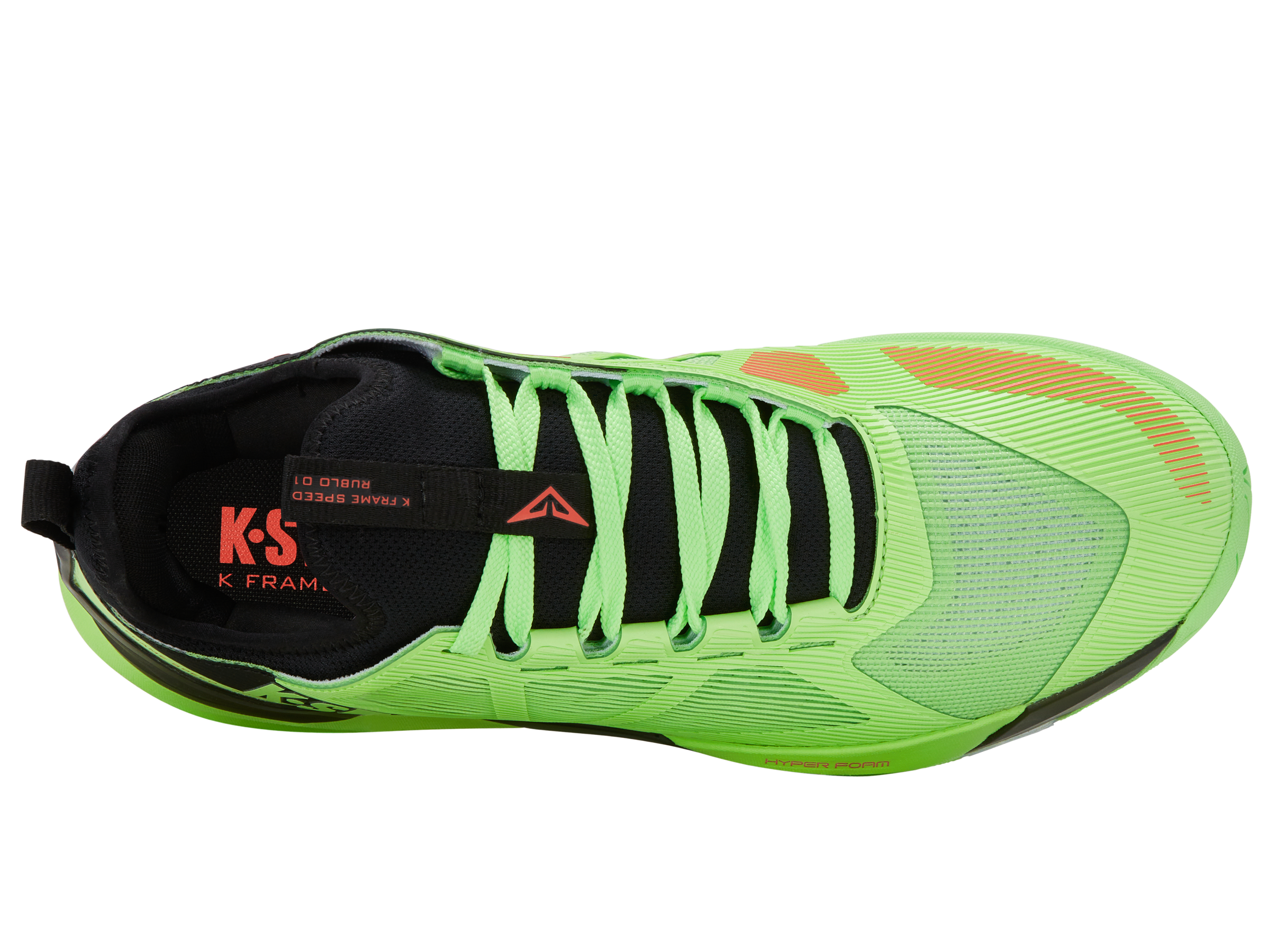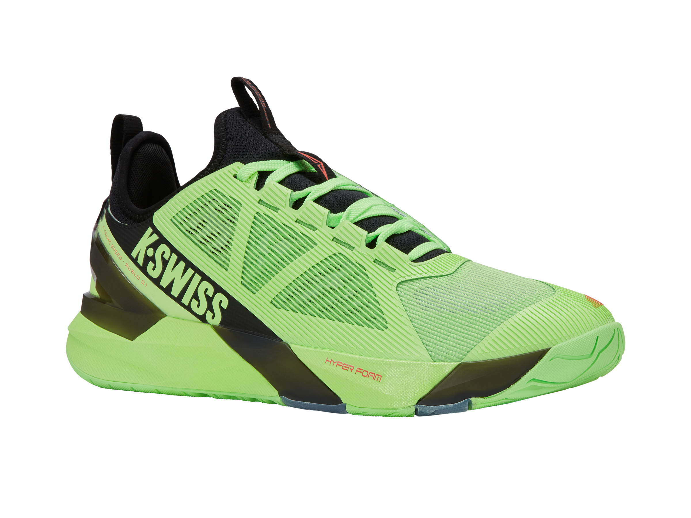 The K-Frame Speed Rublo, co-designed with Andrey Rublev, features a TPU K-Frame for forefoot stability, Hyper Foam midsole for energy return, and a lightweight Duraprint upper for breathability and durability.