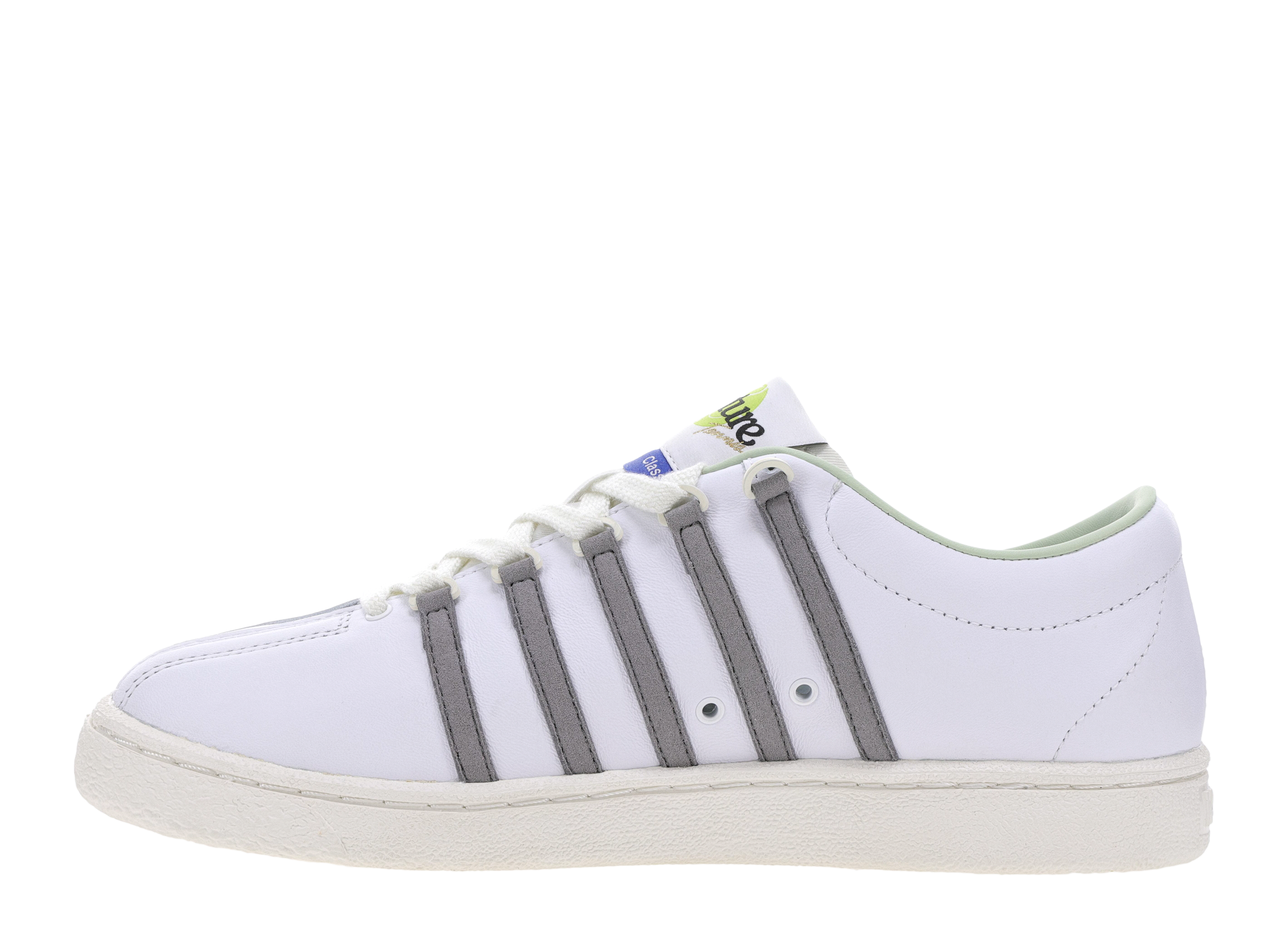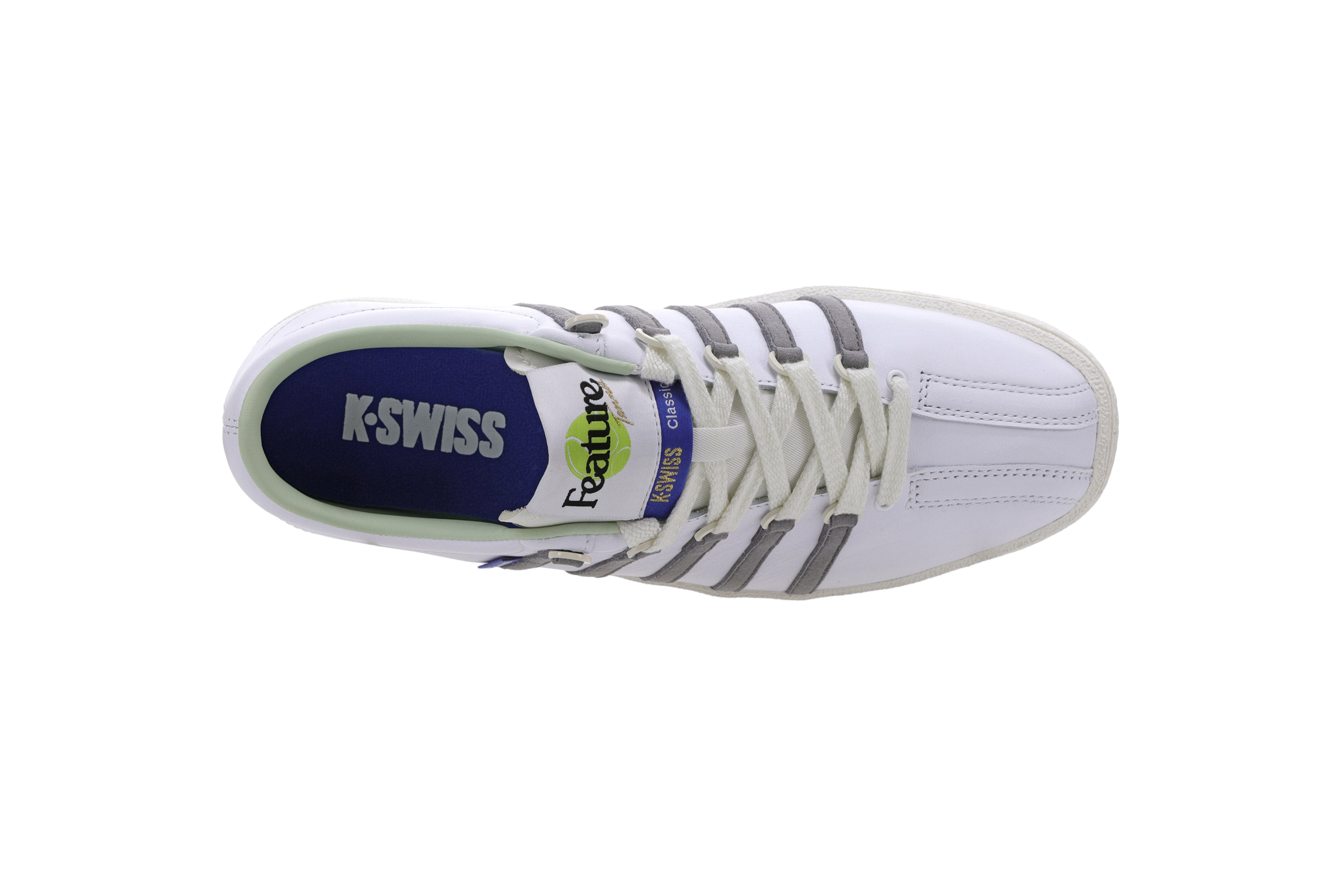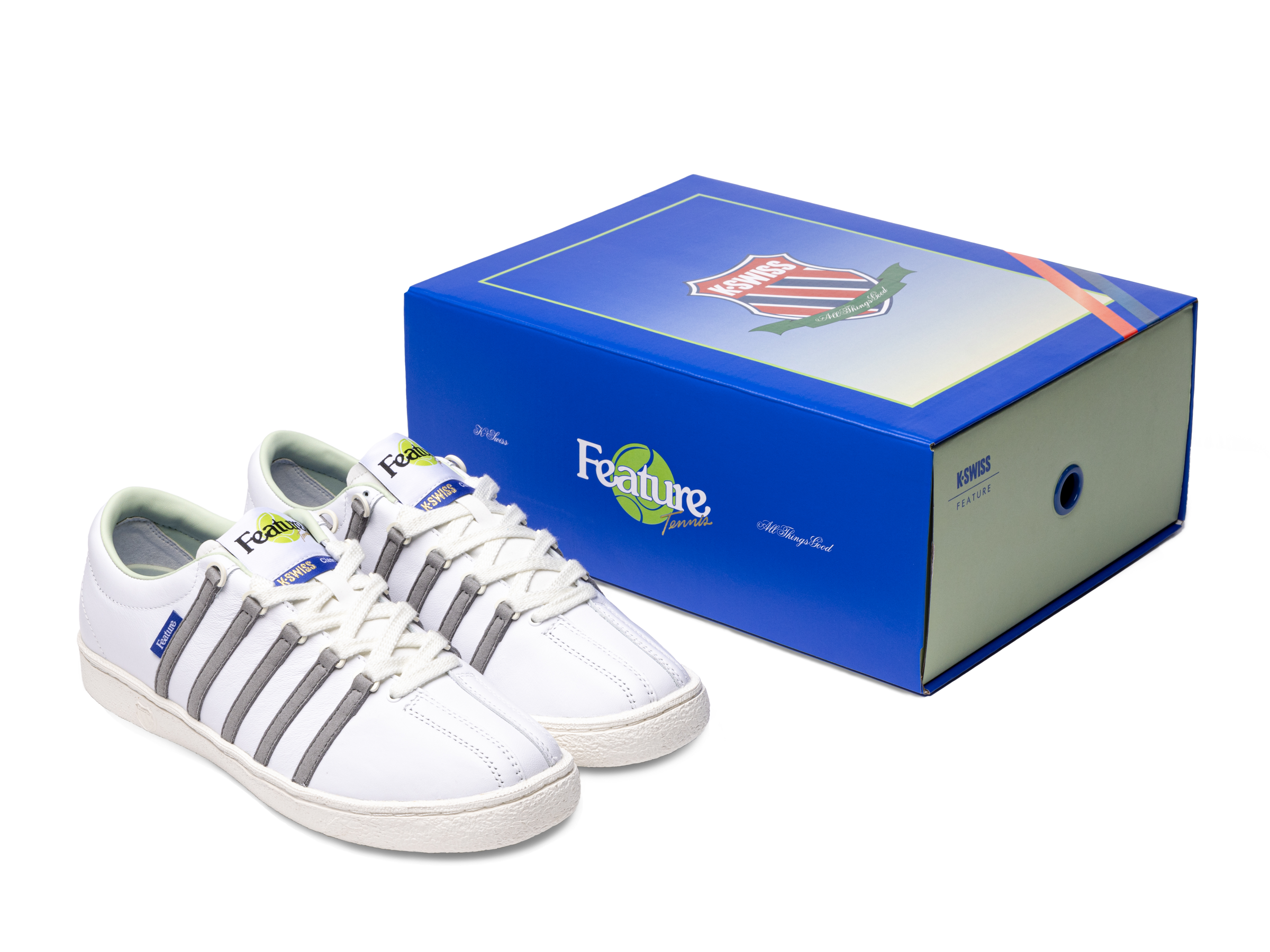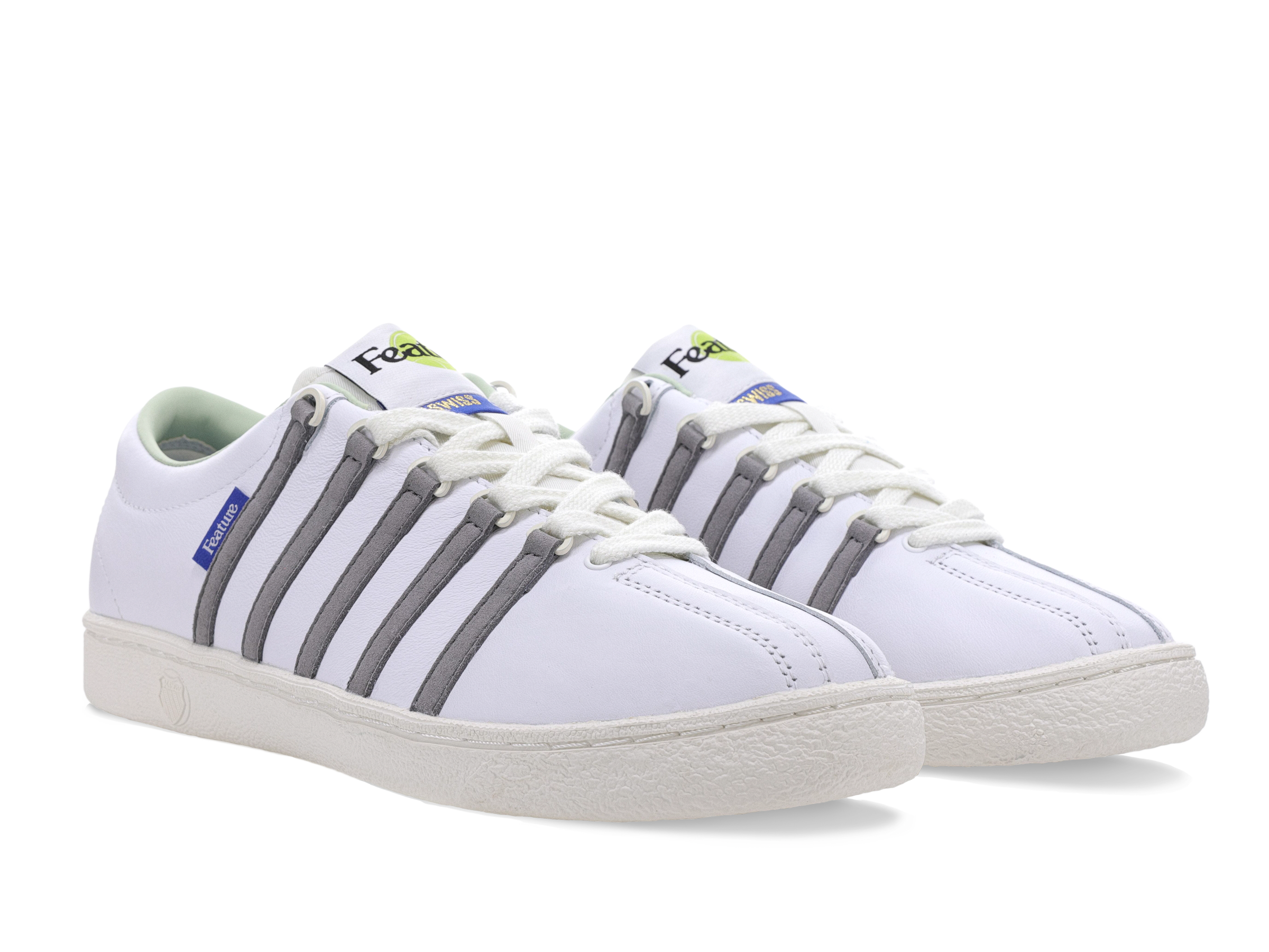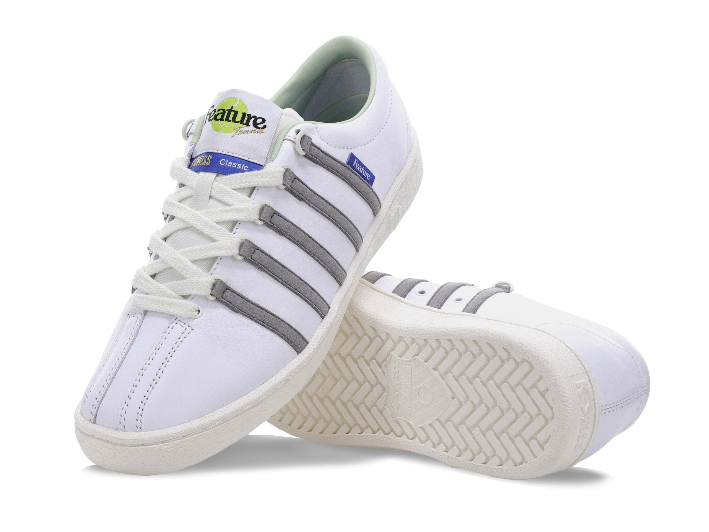 K-Swiss joins FEATURE to introduce the newest iteration of ‘The Classic.’ In 1966, K-Swiss crafted their first sneaker ‘The Classic’ with a perfect balance of heritage tennis and modern day styling. The D-rings and three-piece toe were designed to support the lateral movements essential to the game of tennis. Over the years, the shoe has gone through subtle variations in material and silhouette, all while retaining its signature, timeless look. The FEATURE x K-Swiss adaptation of the iconic sneaker sports a Marshmallow leather upper with the brands signature leather striped overlay, now in Frost Grey. FEATURE tag branding can be seen on the lateral side, and the custom tongue tag sports a tennis ball stitched detail. The rubber outsole has K-Swiss debossed branding to round off the look.